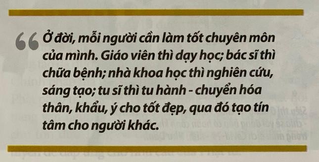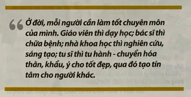 Ở đời, mỗi người cần làm tốt chuyên môn của mình. Giáo viên thì dạy học; bác sĩ thì chữa bệnh; nhà khoa học thì nghiên cứu, sáng tạo; tu sĩ thì tu hành - chuyển hóa thân, khẩu, ý cho tốt đẹp, qua đó tạo tín tâm cho người khác. Họ tuy không trực tiếp tạo ra lương thực, thực phẩm nhưng lại đóng góp một phần không nhỏ cho xã hội. Một bác sĩ mà lấy việc cấy cày làm chính thì không còn là bác sĩ nữa. Người tu cũng vậy, không thể để việc kinh doanh cản trở đường tu. “Người xuất gia là cất bước thì muốn vượt tới phương trời cao rộng, tâm tính và hình dung khác hẳn thế tục, tiếp nối một cách rạng rỡ dòng giống của Phật, làm cho quân đội của ma phải rúng động khuất phục, với mục đích báo đáp bốn ân, cứu vớt ba cõi” (văn Cảnh sách - Tổ Quy Sơn).