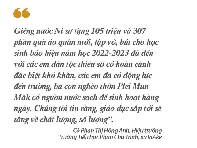 “Khẩu hiệu của trường là ‘mỗi ngày đến trường là một ngày vui’, nhưng nếu không có sự tiếp sức của Ni sư, cái kẹo, cái bánh, bộ đồ mới để các em đến trường thì chặng đường kéo các con đến với con chữ rất xa, giáo viên rất vất vả. Những phần quà của Ni sư giúp thầy cô giáo chúng tôi bớt đi nhọc nhằn, có thêm sức để dìu dắt học trò nghèo đến trường, đến lớp”, cô Kpă H’Nhíp, 20 năm công tác Trường Tiểu học Nguyễn Công Trứ, điểm trường làng Plei Ring 1+2, xã H.Bông, huyện Chư Sê.