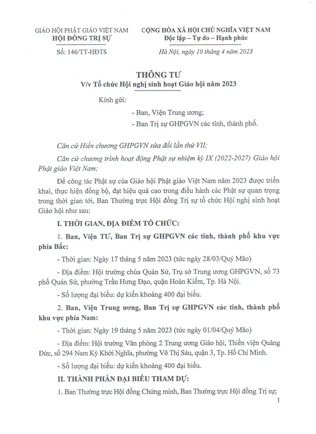 Ban, Viện TƯ, Ban Trị sự GHPGVN các tỉnh, thành phố khu vực phía Bắc, vào ngày 17-5-2023 (tức ngày 28-3-Quý Mão), tại hội trường chùa Quán Sứ, Trụ sở T.Ư GHPGVN, số 73 phố Quán Sứ, P.Trần Hưng Đạo, Q.Hoàn Kiếm, TP.Hà Nội. Số lượng dự kiến khoảng 400 đại biểu.