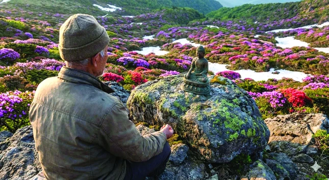 Ông trân trọng đặt tượng Phật trên tảng đá to rồi trải tấm bạt ngồi xuống. Trên đỉnh núi cao hùng vĩ giữa không gian thanh tịnh tinh khiết, ông Ken chắp tay thành kính trước ngực, thở nhẹ, thở sâu. Ông nhìn Phật với đôi mắt cung kính tràn đầy yêu thương.