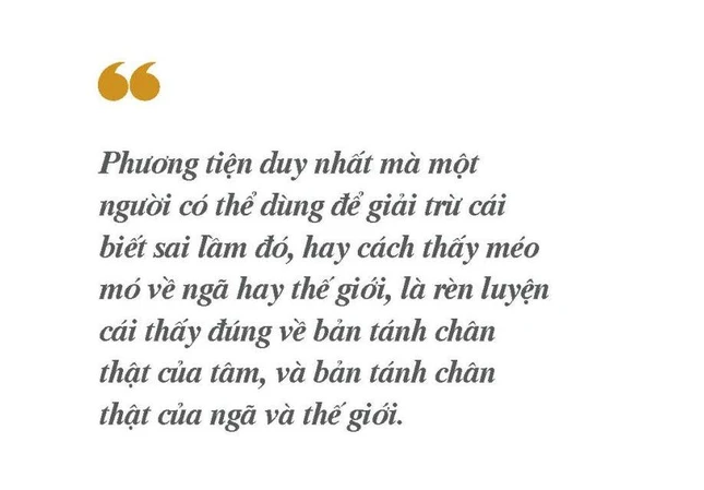 Đặc biệt, chúng ta đang đề cập đến những trạng thái hư vọng của tâm đặt nền trên cách nhận thức méo mó về cái ngã của chúng ta và thế giới. Phương tiện duy nhất mà một người có thể dùng để giải trừ cái biết sai lầm đó, hay cách thấy méo mó về ngã hay thế giới, là rèn luyện cái thấy đúng về bản tánh chân thật của tâm, và bản tánh chân thật của ngã và thế giới.