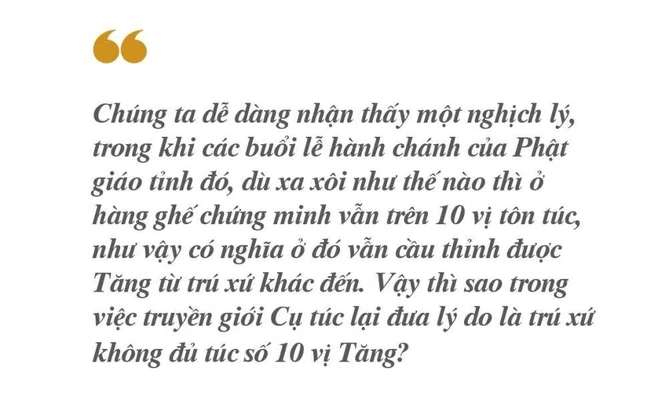 Chúng ta dễ dàng nhận thấy một nghịch lý ở đây, trong khi các buổi lễ hành chánh của Phật giáo tỉnh đó, dù xa xôi như thế nào thì ở hàng ghế chứng minh vẫn trên 10 vị tôn túc, như vậy có nghĩa ở đó vẫn cầu thỉnh được Tăng từ trú xứ khác đến. Vậy thì sao trong việc truyền giới Cụ túc lại đưa lý do là trú xứ không đủ túc số 10 vị Tăng? Đây là một vấn đề cần được chư tôn đức và các giới tử quan tâm.