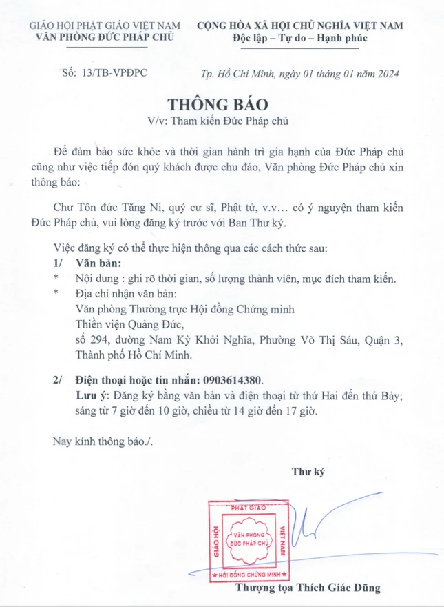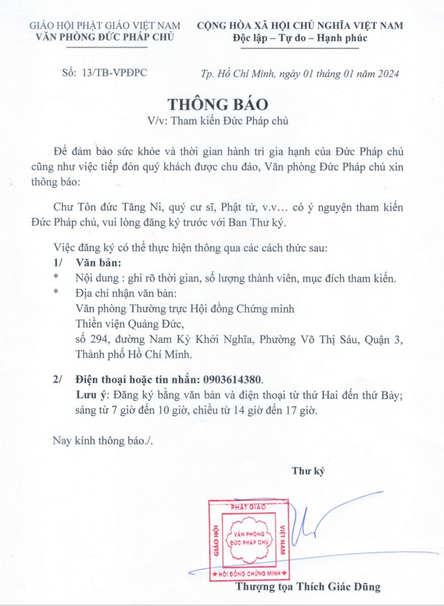Theo đó, thông báo của Thượng tọa Thích Giác Dũng cho biết: "Để đảm bảo sức khỏe và thời gian hành trì gia hạnh của Đức Pháp chủ cũng như việc tiếp đón quý khách được chu đáo, Văn phòng Đức Pháp chủ xin thông báo: