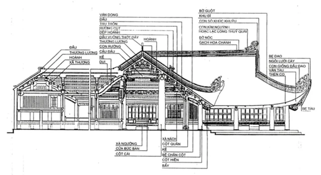 Các công trình kiến trúc cổ đều làm bằng gỗ lim có thể chịu đựng khí hậu nhiệt đới qua nhiều thế kỷ. Loại cột có đường kính to nhất 70 - 80cm được coi là tiêu chuẩn chung của cột đình làng. Sử dụng gỗ trong kiến trúc liên quan đến “lối kéo cột” quen thuộc của từng vùng. Trung Bộ có lối nhà rội, nhà rường; Bắc Bộ có lối nhà chồng rường trên 3 hay 4 hàng cột. Những xà nhà lớn chồng lên nhau, có những “trụ non” hay “đất rường” ken vào kẻ tận cùng bằng “con cung” ở gần góc mái và thay thế vì kèo tam giác là một lối vì kèo không quen biết trong kiến trúc cổ truyền của người Việt. Kỹ thuật tinh xảo đã tạo nên những mộng vững chắc ở đầu cột, nhất là ở chỗ nối với câu đầu, kẻ ngồi và xà thượng. Vì kèo nọ giằng với vì kèo kia bằng một hệ thống xà (xà thượng, xà tứ); gần mặt tảng, các “địa thu” nối liền chân cột nọ với chân cột kia, tất cả tạo nên một bộ khung bằng gỗ tháo lắp dễ dàng và không biết đến một cái đanh nào bằng sắt”(4). Trong kiến trúc Việt cổ truyền, khung nhà hoàn toàn bằng gỗ thì tường ngăn cũng làm bằng những ván “liệt bản” nối liền nhau bằng những “đố búp măng” hay những đố gỗ lớn chạm trổ công phu.