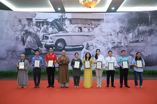Dịp này, Ban Thông tin - Truyền thông GHPGVN TP.HCM trao tặng Thư tri ân của Hòa thượng Thích Lệ Trang, Phó Chủ tịch Hội đồng Trị sự, Trưởng ban Trị sự GHPGVN TP.HCM và quà lưu niệm của Giáo hội đến tất cả đơn vị, nhóm, tình nguyện viên đã hỗ trợ tổ chức Lễ chiêm bái xá-lợi Trái tim Bồ-tát Thích Quảng Đức tại Việt Nam Quốc Tự thành tựu.