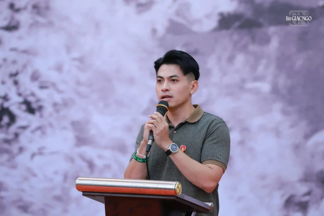 Anh Nguyễn Vĩnh Kha thay mặt lực lượng tình nguyện viên, sinh viên các trường đại học tham gia phụng sự phát biểu |