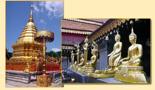 Những ngôi đền cổ kính và trang nghiêm ở Thái Lan được xây dựng trên các ngọn đồi lộng gió. Tiêu biểu trong hệ thống đền chùa Vàng ở nước này là đền Wat Phra That Doi Suthep - khu danh lam quan trọng và nổi bật nhất của Chiangmai. Khu đền được xây dựng trên đỉnh núi Suthep cao 1676m, từ đó có thể nhìn xuống toàn cảnh thành phố trên phông nền núi rừng tuyệt đẹp. Khu đền có từ năm 1383 nhà vua Ku Na đã cho xây dựng am Chedi trên Doi Suthep vào cuối thế kỷ thứ 14. Ngôi đền đã có nhiều thay đổi trong 600 năm kể từ khi được xây dựng. Đặc biệt trong những năm bùng nổ kinh tế của thập kỷ 90, ngôi đền đã thật sự đổi mới. Ngày nay, đền Doi Suthep được mạ bằng vàng và đá granit luôn lấp lánh trong ánh nắng.