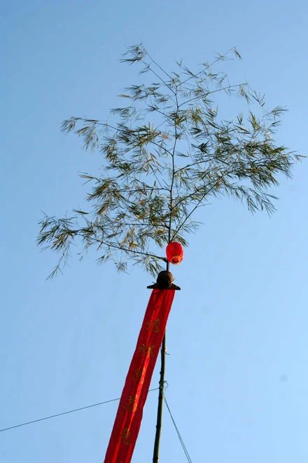 Sáng mồng 7, cây nêu sau 10 ngày ăn tết được trịnh trọng hạ xuống.