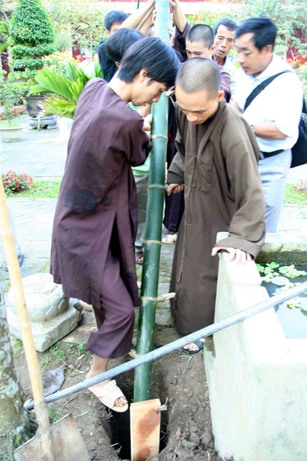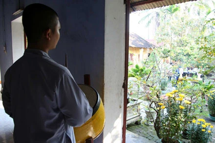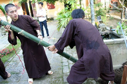 Trong 10 ngày Xuân, các thầy ngoài việc đón tiếp khách viễn cảnh chùa, mỗi tối đều hướng tâm vào cây nêu cầu nguyện cho một năm thuận hòa, quốc thái dân an.