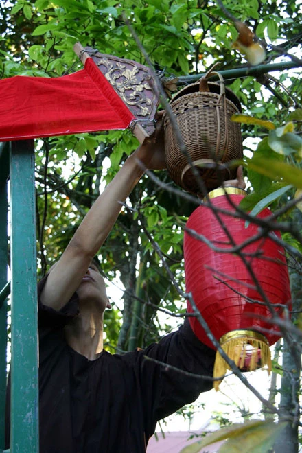 lắp đèn, câu đối và giỏ cau trầu vào nêu