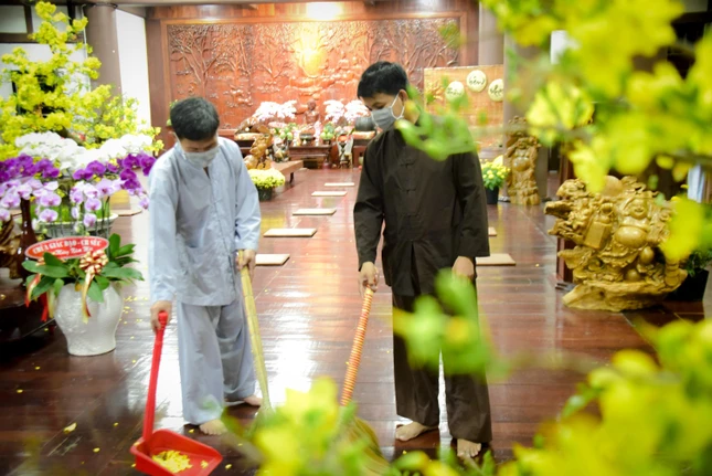 Quét, lau xong, hai chú sắp xếp lại các tấm tọa cụ ngay ngắn, mỗi tấm cách nhau 2 mét để giữ khoảng cách an toàn trong lúc thành phố đang có dịch bệnh lây lan. Phía trên nơi quý Thầy hành lễ những bản kinh Phước đức cũng được đặt sẵn lên kệ để những ngày Tết, Tăng chúng cùng chia nhau một ngày 3 thời hành trì - nhờ đó quý Phật tử về chùa có cơ hội được ngồi lại lắng lòng rót vào những lời pháp thậm sâu.