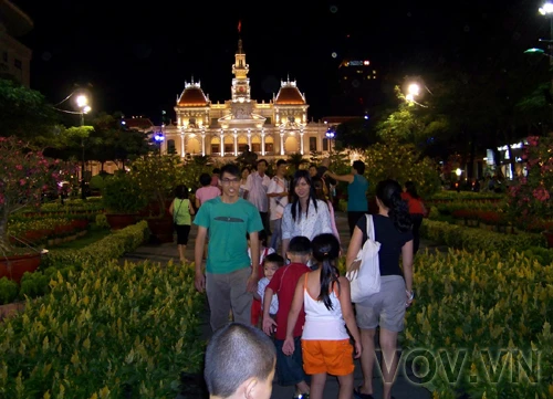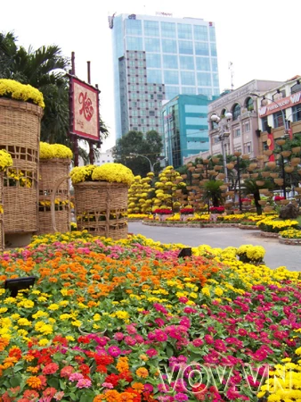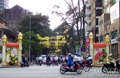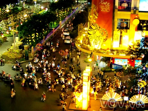 Các trung tâm thương mại, các trục đường chính như Nguyễn Huệ, Lê Lợi, Đồng Khởi… được trang hòang rực rỡ làm cho khung cảnh thêm náo nhiệt, vui tươi.