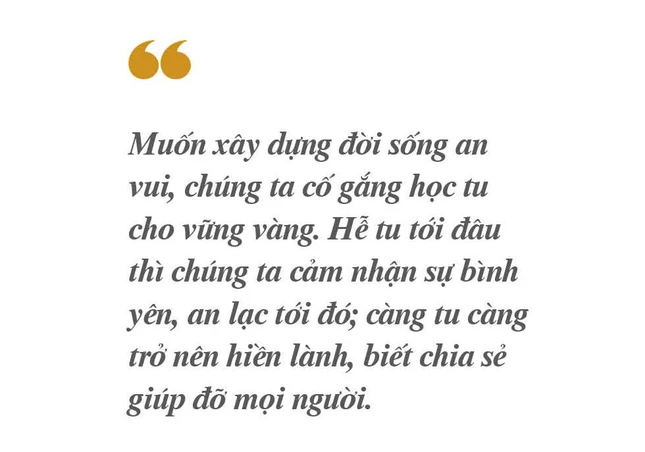 Muốn xây dựng đời sống an vui, chúng ta cố gắng học tu cho vững vàng. Hễ tu tới đâu thì chúng ta cảm nhận sự bình yên, an lạc tới đó; càng tu càng trở nên hiền lành, biết chia sẻ giúp đỡ mọi người. Nhờ tu tập, chúng ta có sự tươi mát, bình ổn nơi nội tâm của mình. Chính chúng ta sẽ là những nhân tố tốt, lành mạnh, từ đó lan tỏa đến những người xung quanh. Còn nếu không có năng lượng trong sự tu tập thì không thể giúp ai được. Mình nói tu mà bản thân vẫn còn đầy những phiền não, thị phi, hơn thua thì chúng ta cần phải kiểm nghiệm lại công phu tu tập của mình rồi.