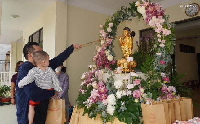 Trong buổi nhận tượng và nến bơ này, có phụ huynh dẫn theo con nhỏ, bế trên tay, để cho con tận hưởng không khí của ngày vui. Nhận quà xong, phụ huynh thực hiện lễ Tắm Phật ngay tại khu vực nhận quà, với niềm hoan hỷ vô biên.
