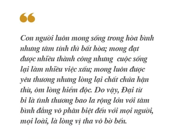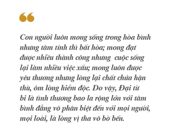 Thứ ba là tinh thần Đại từ bi. Con người luôn mong sống trong hòa bình nhưng tâm tính thì bất hòa; mong đạt được nhiều thành công nhưng cuộc sống lại làm nhiều việc xấu; mong luôn được yêu thương nhưng lòng lại chất chứa hận thù, ôm lòng hiểm độc. Do vậy, Đại từ bi là tình thương bao la rộng lớn với tâm bình đẳng vô phân biệt đến với mọi người, mọi loài, là lòng vị tha vô bờ bến.
