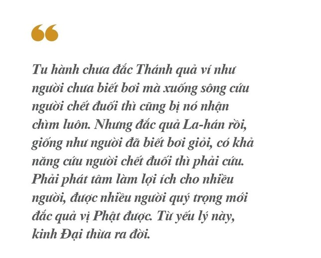 Ngoài ra, Phật dạy các vị đắc La-hán, không còn phiền não cũng nên phát tâm độ sanh. Lúc trước, tu hành chưa đắc Thánh quả ví như người chưa biết bơi mà xuống sông cứu người chết đuối thì cũng bị nó nhận chìm luôn. Nhưng đắc quả La-hán rồi, giống như người đã biết bơi giỏi, có khả năng cứu người chết đuối thì phải cứu. Phải phát tâm làm lợi ích cho nhiều người, được nhiều người quý trọng mới đắc quả vị Phật được. Từ yếu lý này, kinh Đại thừa ra đời.
